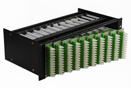 DIO para rack: sua capacidade varia conforme o modelo, podendo chegar a 288 fibras. Oferece fácil acesso às conexões e bandejas retráteis para manutenção. Usado em infraestruturas de telecomunicações, data centers e ambientes corporativos com estrutura de rack.